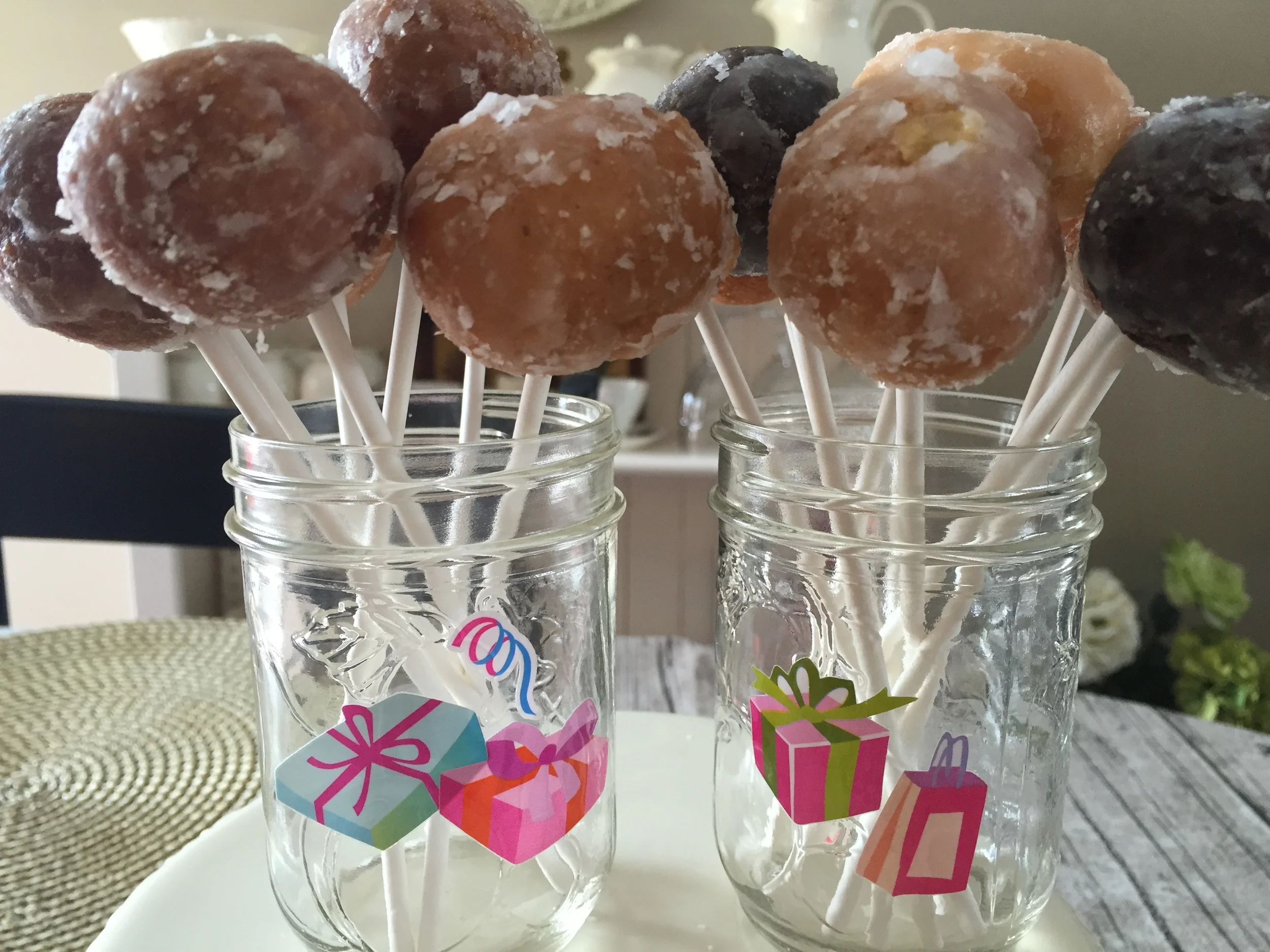 A donut party must have one thing: DONUTS! For starters I made these donut hole "timbit" cake pops! I put them in decorated mason jars and set them on this delicate cake stand. I am really happy with how it turned out.